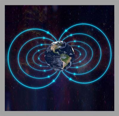 نقشه ساده ای از میدان مغناطیسی کره زمین که منبع میدان مغناطیسی زمین را به صورت یک آهنربا نشان می دهد. قطب شمال زمین در نزدیکی بالای تصویر و قطب جنوب نزدیک پایین آن است. توجه کنید که قطب جنوب آهنربا در اعماق داخل زمین در زیر قطب جنوب مغناطیسی آن است. میدان مغناطیسی زمین حاصل عبور جریان دائم الکتریکی در هسته مایع خارجی آن است.