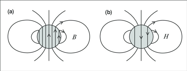 خارج از مواد، میدانهای B و H غیر قابل تشخیص هستند. (آنها تنها در واحدهای خود و مقدار، متفاوتند و درتغییرات زمانی و مکانی تفاوتی ندارند). تنها در داخل مادهای که تفاوت مهم است. میدان B به جریان بستگی دارد (هم ماکروسکوپی وهم میکروسکوپی مانند حرکت الکترون به دور هسته آن). در حالی که میدان H به جریانهای ماکروسکوپی و برداری که به پدیده شار مغناطیسی بسیار نزدیک است، بستگی دارد.