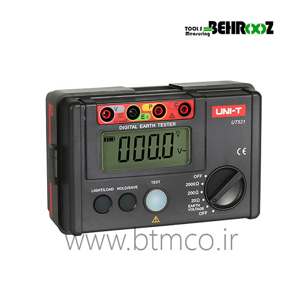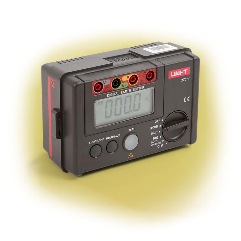 ارت سنج میله ای یونیتی مدل UNI-T UT521 ارت سنج و یا تستر مقاومت چاه ارت ساخت کمپانی یونیتی UNI-T با کیفیت مطلوب و قیمت مناسب و ارزان می تواند به روش های سه سیمه و دو سیمه میزان مقاومت زمین را اندازه گیری کند بعلاوه اینکه این ارت سنج علاوه بر قابلیت اندازه گیری مقاومت میزان ولتاژ زمین را نیز اندازه گیری می کند. ارت سنج میله ای یونیتی مدل UNI-T UT521 دارای سلکتور دستی برای مشخص کردن رنج مقاومت اندازه گری و همچنین اندازه گیری ولتاژ زمین است. قابلیت اندازه گیری مقاومت زمین تا 2 کیلو اهم و اندازه گیری ولتاژ AC زمین از 0 تا 200 ولت در فرکانس 50 تا 60 هرتز و نمایشگر بزرگ به همراه نور پس زمینه از مهمترین ویژگی های این ارت سنج است. استفاده از این دستگاه بسیار ساده بوده و بدنه محکم با دو پوشش باعث شده تا دستگاه در برابر ضربه مقاومت بالای داشته باشد.