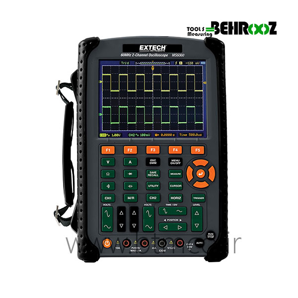 اسیلوسکوپ دیجیتال پرتابل اکستک EXTECH MS6060 یک دستگاه اندازه گیری است که از آن برای مشاهده شکل موج ها و اندازه گیری ولتاژ ، زمان تناوب ، اختلاف فاز و همچنین مشاهده منحنی مشخصه ولت – آمپر عناصر نیمه هادی مانند دیود و ترانزیستور استفاده می شود . اسیلوسکوپ یک ولت متر دقیق است ولی توانایی اندازه گیری جریان را به طور مستقیم ندارد و برای اندازه گیری جریان باید از روش های غیر مستقیم مانند قانون اهم استفاده کرد . یکی از مزایای اسیلوسکوپ این است که بر خلاف مولتی مترهای معمولی ، در فرکانس های بالا نیز به