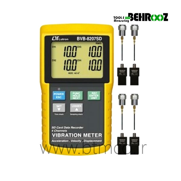 لرزش سنج لوترون مدل Lutron BVB-8207SD با داشتن چهار کانال اندازه گیری مجزا می تواند به راحتی از قسمت های مختلف یک دستگاه نمونه برداری انجام دهد و با قابلیت ذخیره سازی هم زمان اطلاعات بر روی کارت حافظه گزارشی کامل و جامع در خصوص نحوه عملکرد دستگاه بدهد. این لرزش سنج با رنج فرکانسی گسترده و دقت بالا می تواند با اندازه گیری میزان لرزش گزارشی در خصوص صحت عملکرد دستکاه ، میزان لقی و یا انحراف قطعات محرک را به کاربر بدهد.