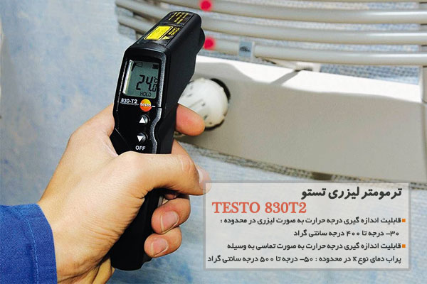 ترمومتر لیزری، ترمومتر تفنگی و دماسنج لیزری تستو مدل TESTO 830T2 با کد محصول 05608312 قابلیت اندازه گیری درجه حرارت به صورت لیزری در محدوده : -۳۰ درجه تا ۴۰۰ درجه سانتی گراد را با دقت قابل قبول و سرعت پاسخ دهی بالایی را دارد . شرکت بازرگانی بین المللی ابزار دقیق بهروز نماینده رسمی تستو در ایران خرید آنلاین ارزانتر از هر جایی را برایتان تضمین خواهد کرد .