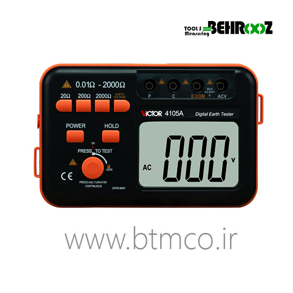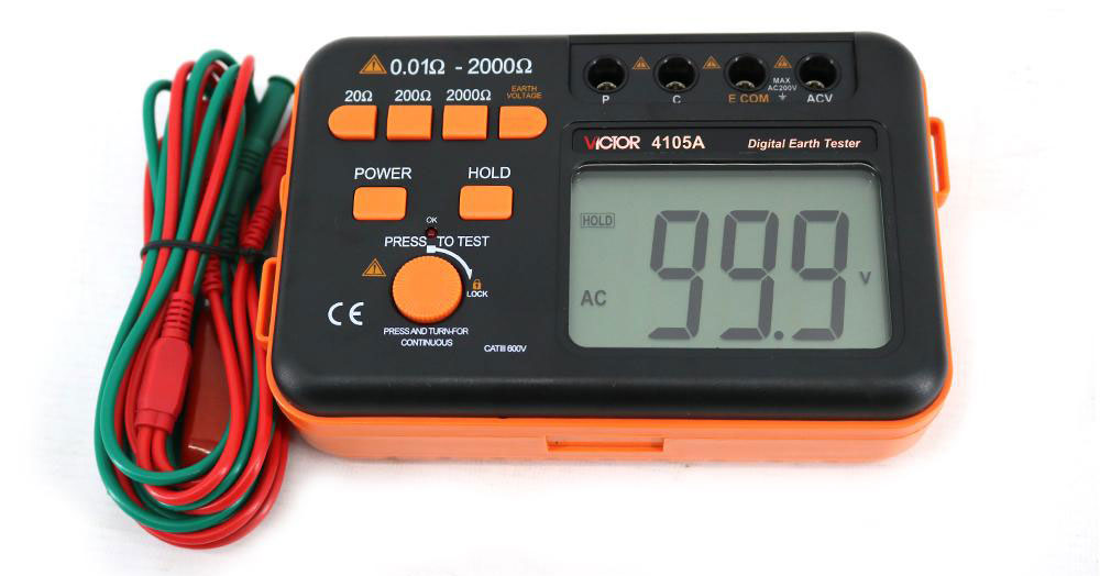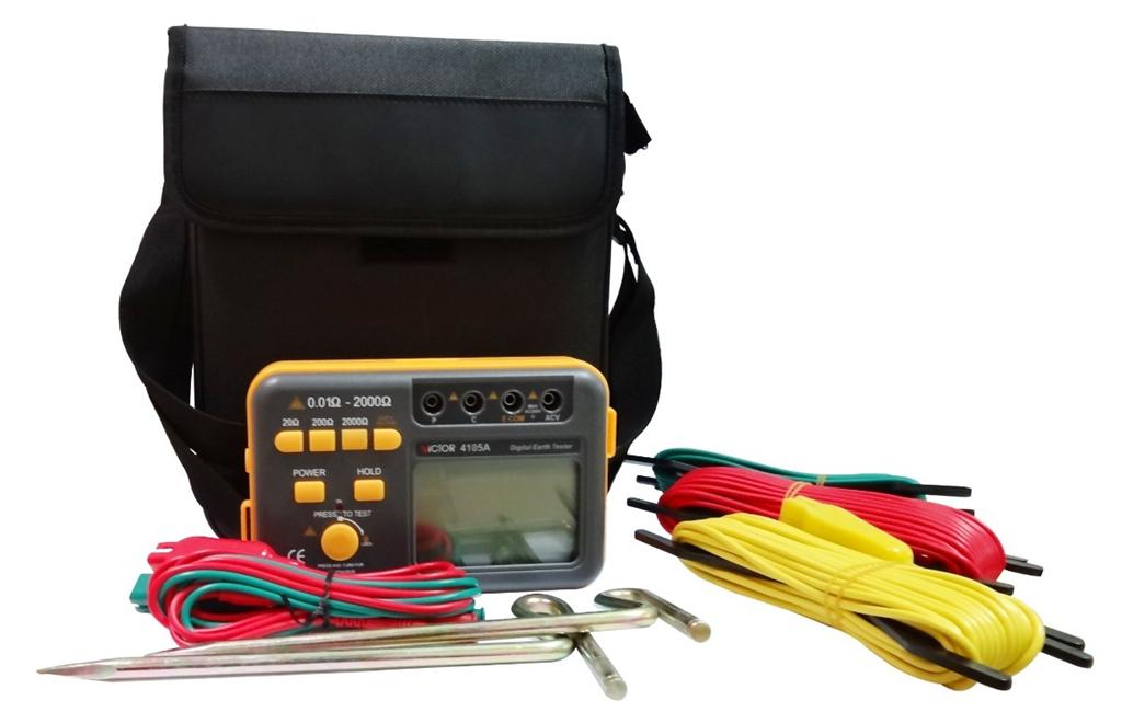 ارت سنج سه سیمه مدل VICTOR 4105A یک از ارت سنج ارزان قیمت برند ویکتور می باشد. برای اندازه گیری مقاومت چاه ارت نیاز به خرید ارت سنج می باشد با توجه به انواع ارت سنج برای چاه ، ارت سنج سه سیمه مدل VICTOR 4105A برای اندازه گیری به روش سه سیمه قابل استفاده است. اهم چاه ارت با توجه به مکان حفر چاه و استاندارد اهم چاه ارت متفاوت است