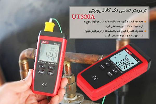 ترمومتر تماسی تک کانال یونیتی مدل UT320A یک دماسنج ترموکوپلی تک کانال از کمپانی UNI-T هنگ کنگ است.  که مناسب برای اندازه گیری دما به روش تماسی و با استفاده از سنسور ترموکوپل است. و قابلیت پشتیبانی از ترموکوپل های نوع K و J را داشته و به لحاظ طراحی بدنه نیز از کیفیت بسیار بالایی برخوردار است. دماسنج تماسی 320a یونیتی دارای قابلیت نمایش مقادیر MAX/MIN/AVG، نمایش دما بر حسب واحد های سانتی گراد و فارنهایت و همچنین مقاومت در برابر سقوط از ارتفاع تا یک متر است.