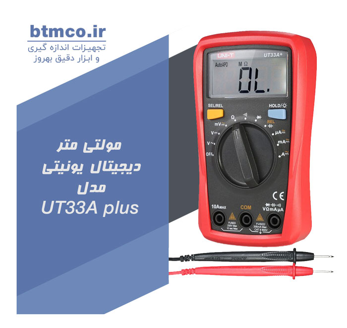 مولتی متر دیجیتال یونیتی مدل UT33A plus دستگاهی ایده آل برای استفاده در محیط های کارگاهی و صنعتی بوده زیرا که دارای روکش پلاستیکی بسیار ضخیم و محکم است که علاوه بر داشتن جایگاهی برای قرار گیری پراب های مولتی متر، از ضربه و آسیب دیدگی اهم متر حتی در سقوط از ارتفاع دو متری محافظت میکند. این مولتی متر ارزان میتواند پارامترهایی نظیر ولتاژ AC و DC ، جریان AC و DC ، مقاومت و ظرفیت خازنی را اندازه گیری کند. آموزش رایگان نحوه کار مولتی متر یونیتی مدلUT 33A plus و ضمانت نامه کتبی در تجهیزات اندازه گیری