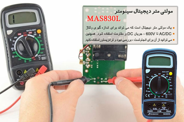 مولتی متر دیجیتال سینومتر مدل MAS830L دستگاهی برای اندازهگیری چند کمیت الکتریکی مانند ولتاژ، جریان، مقاومت الکتریکی، ظرفیت خازنی و ... است، که میتوان با آن سلامت یا مشخصات قطعات الکتریکی را ارزیابی کرد. فروش ویژه مولتی متر دیجیتال سینومتر مدل MAS830L و انواع مولتی متر دیجیتال سینومتر در شرکت ابزار دقیق و تجهیزات الکترونیک بهروز با مناسب ترین قیمت