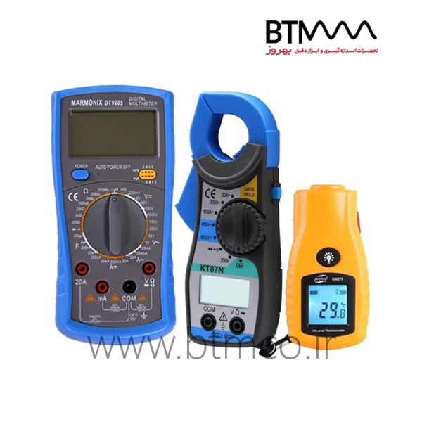 پک مولتی متر و کلمپ آمپر متر و ترمومتر لیزری، این پک شامل مولتی متر دیجیتال مارمونیکس مدل DT-9205 و مولتی متر کلمپی AC مدل KT87N و ترمومتر لیزری جیبی بنتک مدل GM270 می باشد.